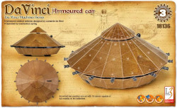 Academy Da Vinci Armoured Car - Academy's Da Vinci Armoured Car is an interpretation of the original drawing, designed during the Renaissance era by the famous Italian scientist and artist, Leonardo da Vinci. This spring powered kit is a joy to build, and snaps together without any tools, glue, batteries and doesn't need painting. Imagine holding a piece of history in your hand and it operates as well. This 5" in diameter armoured car carries 16 guns around its perimeter; it's full size design would have been able to attack from any angle. Academy's technical engineers captured the wonders of this mechanical masterpiece, making the model a joy to build, display or operate. The model contains a spring powered wind-up mechanism so you can actually power the model across a desktop. Part of Academy's Da Vinci Machine Series, this easy to assmble, historical and educational kit would make a terrific introductory model for the budding modeler, or student looking for a "show-and-tell" school project.