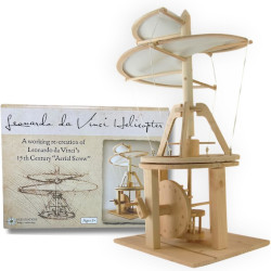 Pathfinders Leonardo DaVinci Aerial Screw Wood Kit One of Leonardo's most iconic images, the Aerial Screw (also known as the Helicopter) illustrates the ingenuity of da Vinci, and indicates his obsession with flying. While this idea may never have got off the ground, for some basic technical reasons, it gave us an insight into the different ways in which Leonardo considered the challenge of human powered flying, and defines him as an inventor well ahead of his time. While it is often referred to as a helicopter, the premise of the lift to make it rise is more like archimedes screw than the rotors of a helicopter. This model uses one of the bevel gears he drew in his codices and creates a nice 2 to 1 increase in speed of the crankshaft, so the mast spins quickly, illustrating the manner in which this machine would have worked. Kit features pieces that are drilled and pegged for strength, the canopy and support structure are removeable for experimenting, and lots of interesting information about how it works. Kit stands about 15" tall and 9" across.