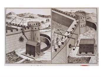 Battering Rams: They were large mechanical objects, often on wheels that were used to ram the walls and doors of a castle in an attempt to break them down. Often times battering rams were part of a siege tower. The image at left shows early roman era battering rams. They have wooden structures around them to protect the operators of the ram.