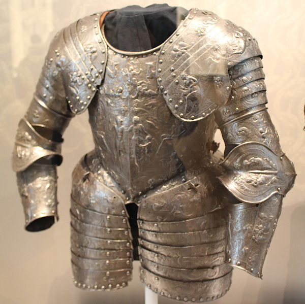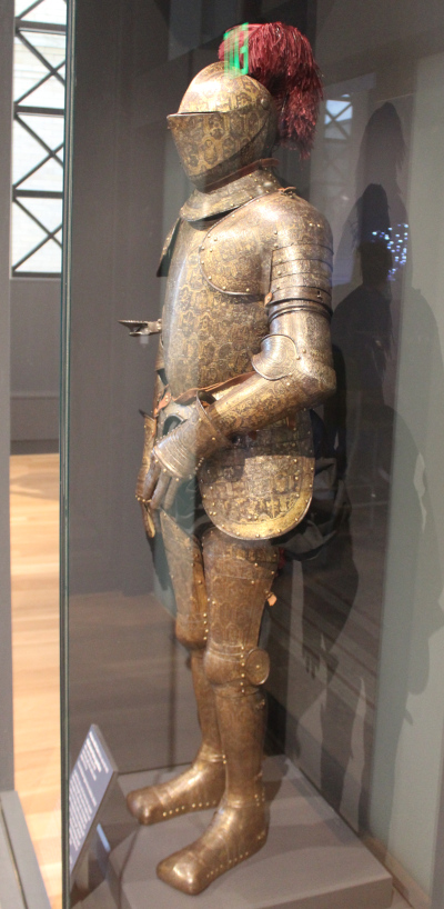 Although fully usable in battle, this suit is also a fashion statement. The shape of the breastplate imitates a man's civilian jacket, and the etched and gilt surface resembles the patterned silks and velvets of stylish clothing. The designs derive from ancient Roman art, connectin the wearer with the culture of classical antiquity.