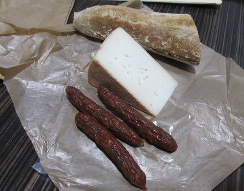 I had a great conversation with the owner of the shop. He is quite a cheese expert so I asked him to recommend a cheese for me. My only caveat was that I was looking for some kind of a goat's milk cheese. It is something I have not tried yet. So, he sliced me off a generous piece of Blakesville Sunny Ridge Goat cheese. And with a bit of conversation I talked about how people often pair up cheese with various other foods. So he recommended I eat it with a good bread and some pepperoni, maybe even an apple or an orange. But he had the pepperoni and some terrific sourdough bread right there. Here is the wedge of cheese. I sat at the little table in my motel room and enjoy the cheese, bread, and pepperoni.