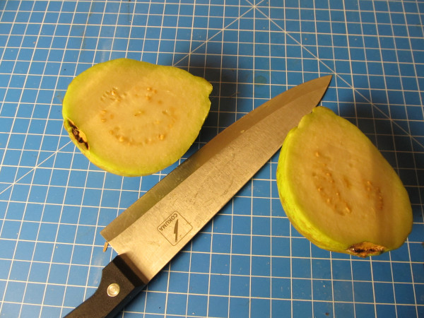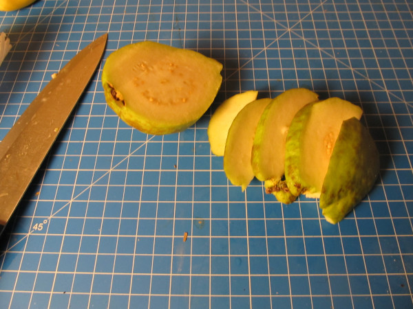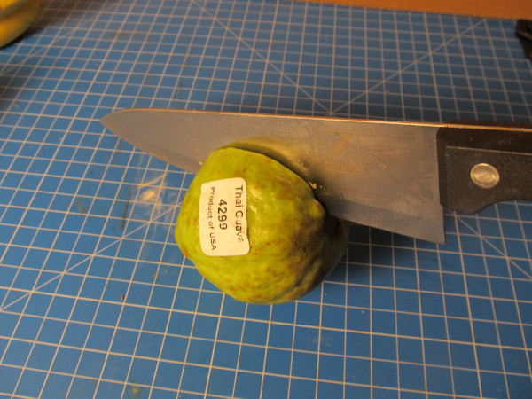 Will's Review: it is about the size of an apple. And I was a bit suprised by the mesh covering it comes in. Maybe when it ripens that skin gets very soft and is easily bruised. Taste: The guave has a mild tropical taste, not strong. And it has the consistency of a soft pear. You can detect the seeds but they are not overwhelming.