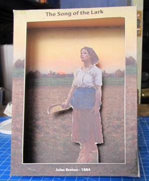 This is the completed scene and sound box that we make. It is a three-dimensional rendition of a famous painting. And we take it to another level by adding actual sounds of a Lark singing! (You can hear the birdsong in this project by watching the Youtube video at the bottom of the page) We do this very easily by using a recordable greeting card, to the back of the project, that you can buy on Amazon. You can however simply make the scene box without the sound effects.