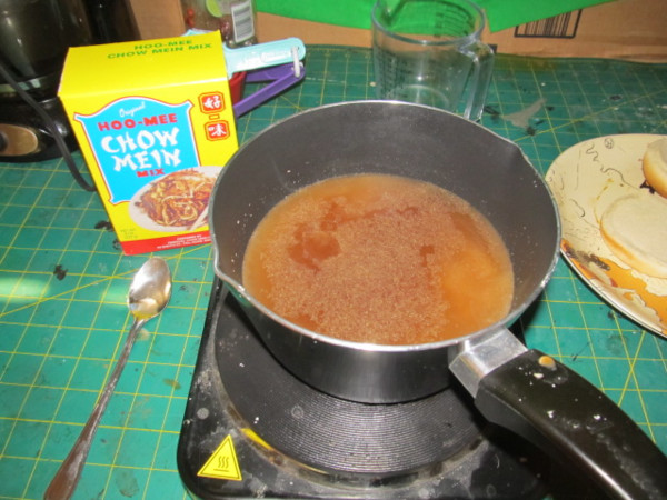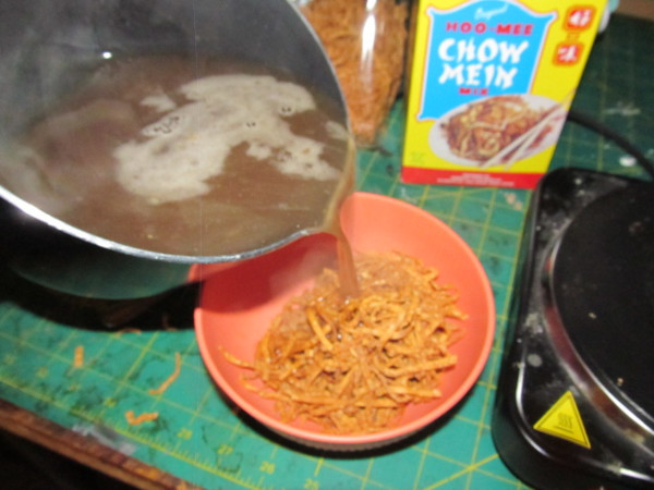 Here is a look inside. You can just walk in and purchase a variety of chow mein packages. Instructions are on the box. And here are the contents. There is a 1oz packet of gravy and a packet of noodles. Dissolve the contents of the gravy packet with 1/2 cup of warm water. Then stir that mixture into 3 cups of boiling soup stock or water. to make the gravy