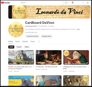 My Youtube channel entitled "Cardboard da Vinci". It has lots of things about da Vinci and it has a whole lot of stuff about making things, tutorials, arts, crafts, and more. Be more creative! Be more da Vinci. You can visit the channel on youtube right here: Cardboard da Vinci. You can also watch all the videos without leaving this website right here: Cardboard da Vinci videos