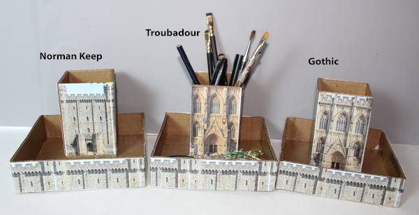 A big thing about this project and video is that I give you 7 useful tips for working with cardboard. So, even if you don't make the pencil holder you still will get something out of the video. I have a Youtube video right here on this page that shows you how to make this pencil holder. And I have the template with all three variations of the pencil holder. You print it up, cut out the pieces and glue them to your pencil holder. The three styles are Norman Keep, Troubadour castle and Gothic Cathedral.