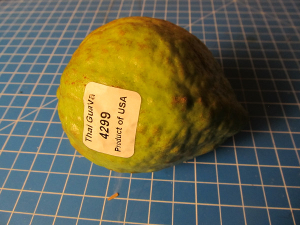 Will's Review: it is about the size of an apple. And I was a bit suprised by the mesh covering it comes in. Maybe when it ripens that skin gets very soft and is easily bruised. Taste: The guave has a mild tropical taste, not strong. And it has the consistency of a soft pear. You can detect the seeds but they are not overwhelming.
