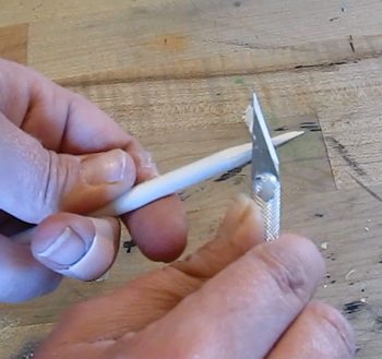 And cut about a ten inch piece of dowel pin and add a sharp point on one end of it. This will come in handy when we are punching holes.