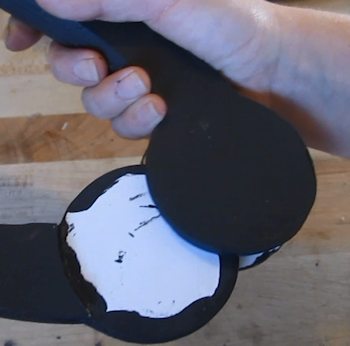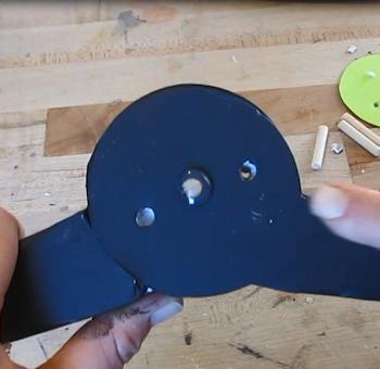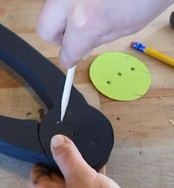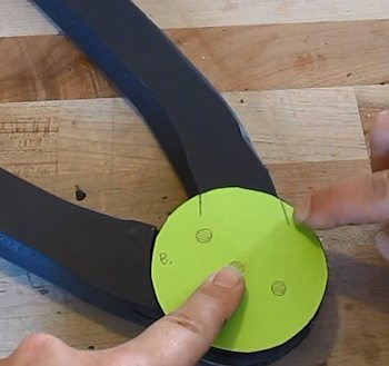 We are working on the B piece here so take the round B template that you had cut off and place it on the hinge like this. Notice how the lines match up with one of the arms.
