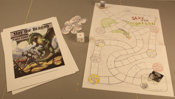 The complete package is ten pages long and comes with everything you need including the game board, the game pieces and the rule book. There is also a dice you can cut out and assemble if you need one. The best thing to do with this is to print it up and glue or glue stick the board and pieces to cereal box cardboard and once it dries you cut the pieces out. It is a Microsoft Word Document and you can print it out here: (Slay the Dragon Paper Game download) I also have more free paper games at the bottom of this page.