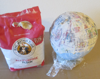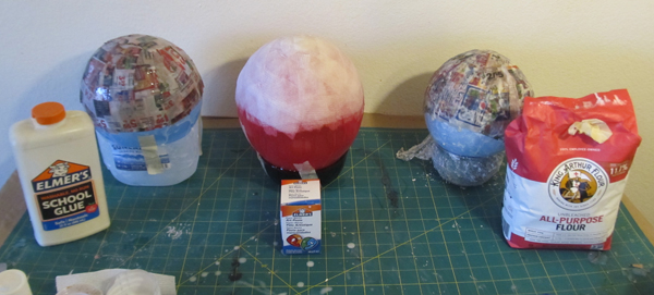 If you are not familiar with paper mache it is a simple process. This picture shows it all. 1) you mix a paste together 2) you dip strips of paper or cloth in it and 3) you apply those strips to a mold or shape. Once it dries it hardens and you can remove it from the mold. Or in this case you can pop the balloon.