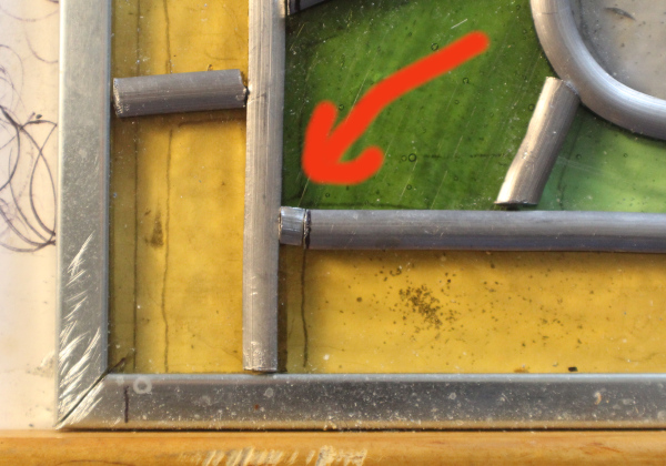 First off, unless you are an experienced stained glass maker, this is going to be normal. And it is particular accentuated when the window you are making has a lot of irregular or complex shapes. You could try to just bridge the gap with solder. But, that's not optimal. It has an effect on how it looks, how strong it is, and how waterproof it is. The solution is pretty easy. Cut two small pieces of lead came and insert them into the gap. One piece goes on this side of the window. And one piece goes on the other side of the window.