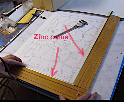 The glass fits into the zinc came just like it does in the lead. Notice how the zinc piece h the extra space on the right side. You should consider this when measuring out your project. And when setting up the wood pieces around our template.