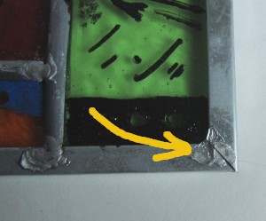 You cut the zinc with a hacksaw. And the various pieces will, in a later stage, be soldered together with solder and a soldering iron just like you do with the lead. Cut the zinc so it matches up in the corners. This next picture shows you one corner where the two pieces of zinc meet. See how each piece of zinc is cut to 45 degrees? This photo is re-touched. The zinc has been soldered already. I manipulated it by adding a black line to show you how the two pieces of zinc come together at 45 degree angles. Okay! Our project is started! We have the workspace setup and now we are ready to get going with the glass!! Yay! You are probably looking forward to this part.