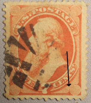 They re-issued this same design two years later in 1873 as the Scott 160. And they wanted a way to secretly differentiate between the two stamps. So, what the USPS did was add a very small secret change to the design. I got it for you below.