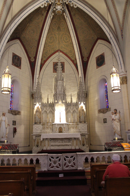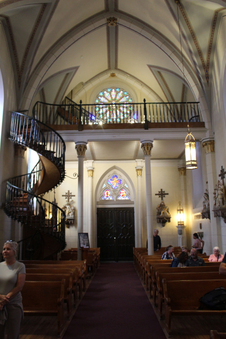 There is quite an amazing story about this spiral staircase that is 150 years old. I will tell you the story and show you some pictures and a video. I have a series of closeup pictures of the stairway on this page right here. I also have pictures of the stained glass windows in this chapel.