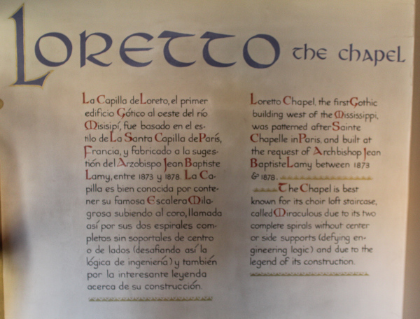 Constructed in 1873, the Loretto Chapel was commissioned by the Sisters of Loretto as a private chapel for their school for girls. Patterned after Saite-Chappelle in Paris, the chapel is believed to be the first gothic structure west of the Mississippi and would have stood out among the one-story adobe structures of the time. As the chapel was nearing completion, the sisters were left with no plans for access to the choir loft twenty feet above. Unable to find a solution, the sisters prayed a nine day novena to their patron, Saint Joseph (Who also happens to be the patron saint of carpenters).